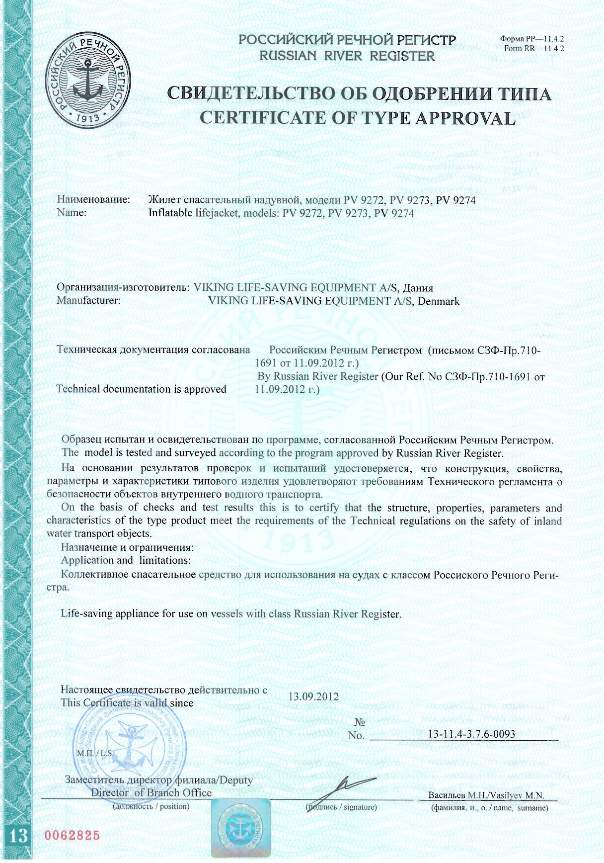 Сертификат об одобрении спасательных жилетов PV 9272 , PV9273, PV9274 № 13-11.4-3.7.6-0093